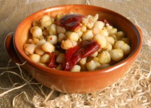 Fare lessare separatamente in abbondante acqua salata il grano tenero che è stato tenuto a bagno almeno da due giorni prima, il mais, che va anch’esso tenuto a bagno per un paio di giorni, i fagioli e i ceci. Mondare dai semi i peperoni sott’aceto e tagliarli a pezzi. Soffriggere in una pentola di terracotta a fuoco lento gli spicchi di aglio e i quattro peperoni. Una volta che i vostri cereali sono pronti e dopo averne eliminato quasi completamente l’acqua di cottura, versare nella pentola del soffritto il grano, il mais, i ceci e i fagioli. Servire la minestra calda o tiepida in piatti fondi.