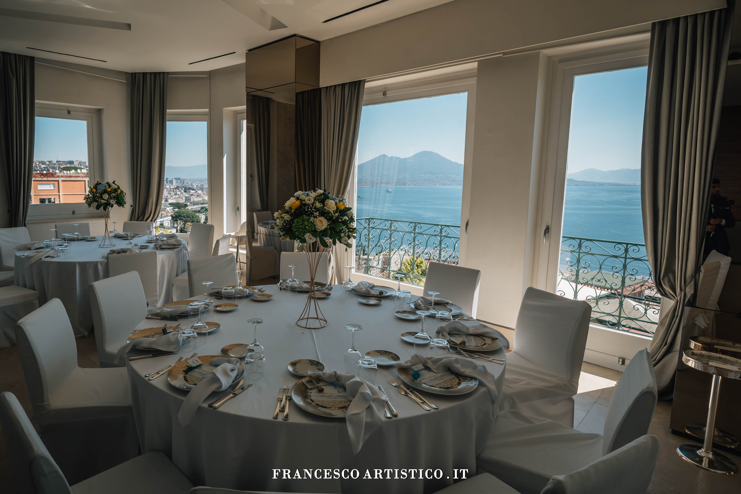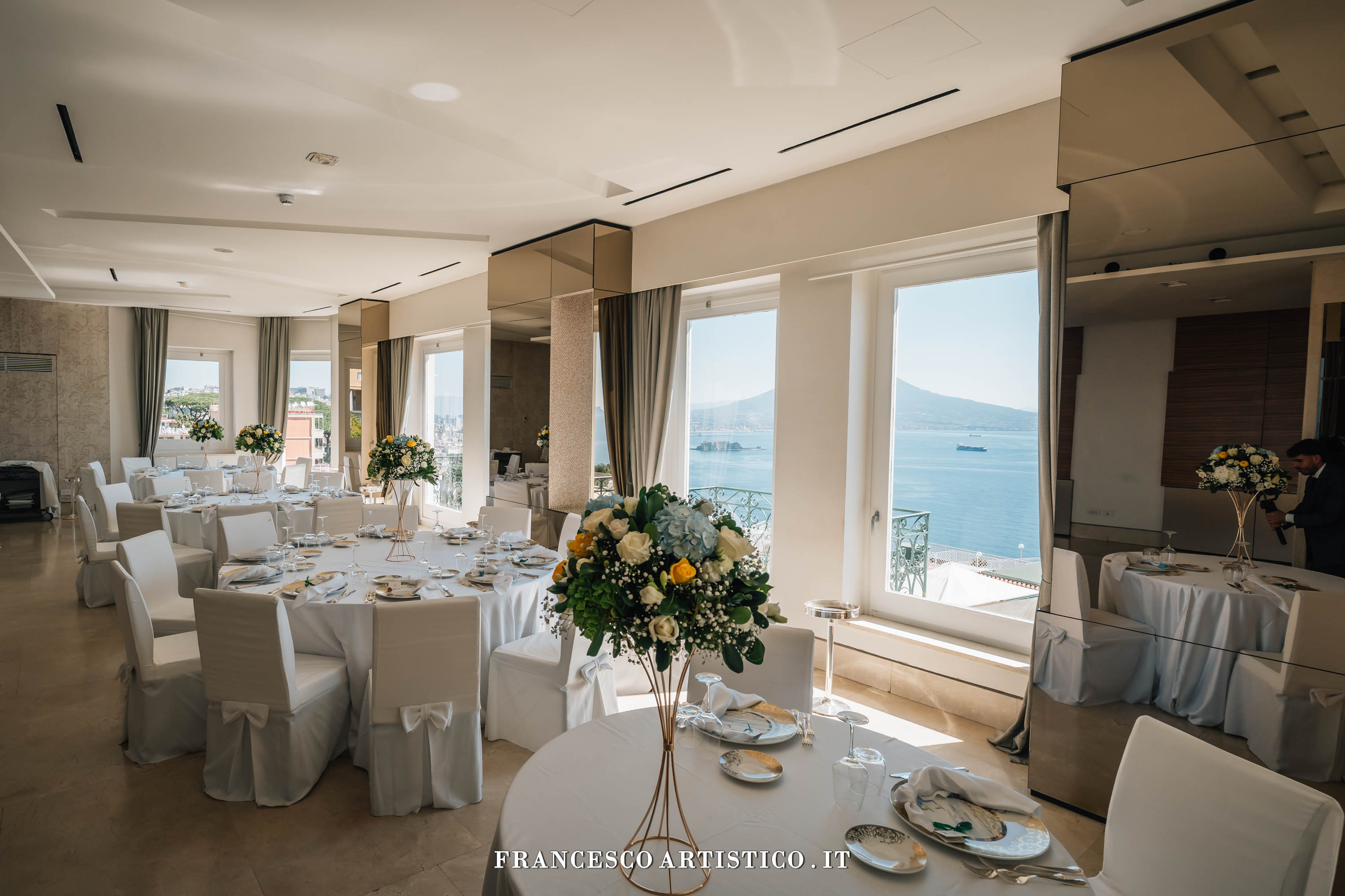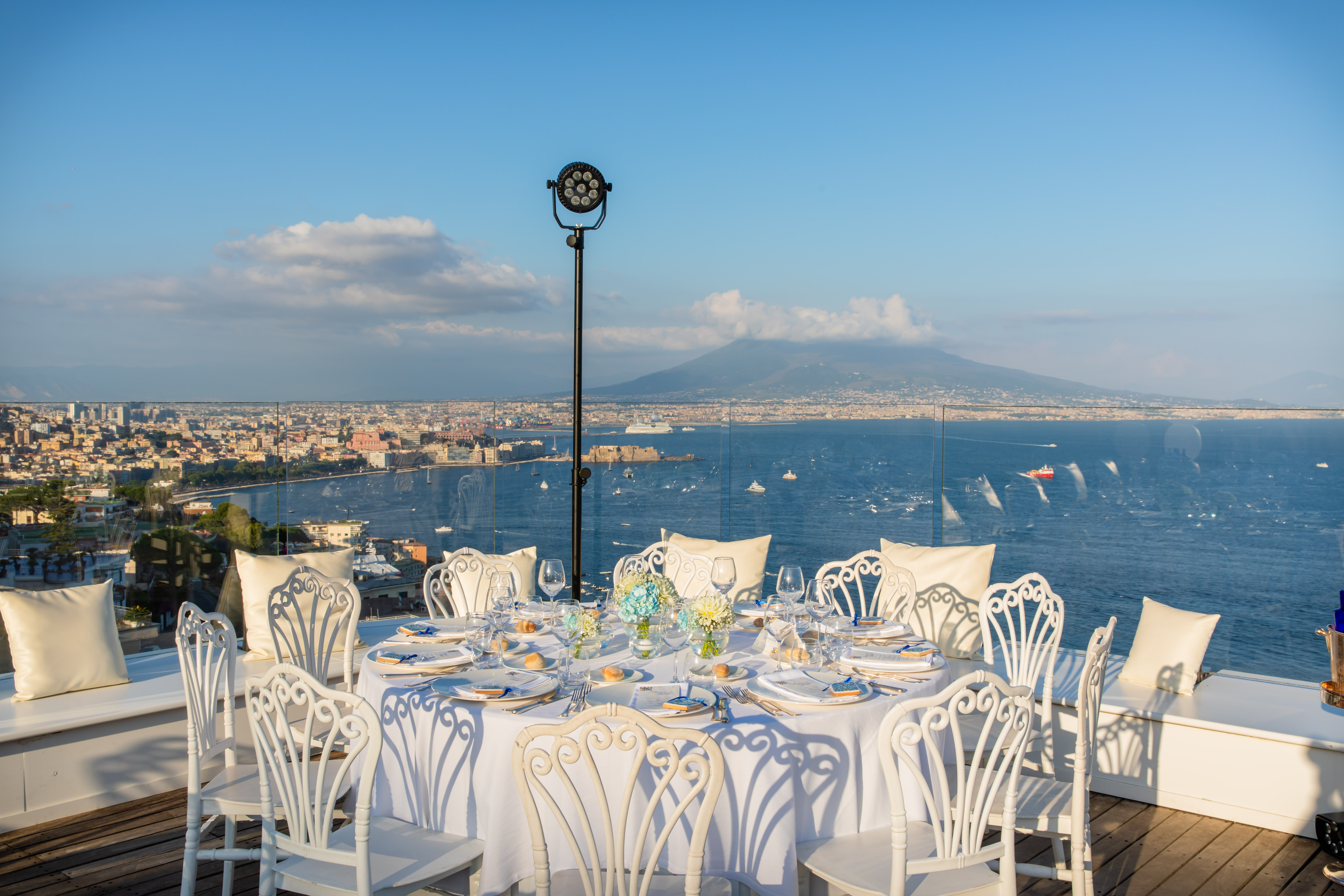 Qui, lo spazio non è mai solo architettura, ma esperienza: le ampie sale interne, luminose e versatili, si aprono verso l’esterno regalando scorci indimenticabili sul Golfo di Napoli. Trasformando ogni evento in un momento scenografico di grande impatto. La Sala Diamante e la Sala Rubino accolgono gli ospiti in ambienti eleganti e panoramici. Mentre il D Restaurant, più intimo e raccolto, offre un’atmosfera riservata arricchita da un giardino curato e da una raffinata zona lounge. All’esterno, la natura diventa protagonista: l’area verde si distingue per il suo equilibrio cromatico, tra il rigoglio della vegetazione, le delicate sfumature floreali e l’azzurro intenso del mare che si estende all’orizzonte, creando una cornice di rara suggestione.