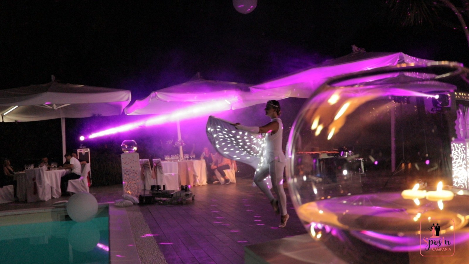Numerose le proposte offerte agli sposi dai vari partner presenti all’evento. Ben tre gli intrattenimenti musicali: Alma Y Musica, Nino Allocca e Alex Duello Dj. Suggestive ed emozionanti le animazioni a bordo piscina e in vasca di Fireworks Animation, mentre Zebby Animation ha coinvolto le coppie con un suggestivo e romantico lancio di palloncini. Presente con la sua simpatia e i trucchi del mestiere Mago Edo, così come l’angolo del caricaturista di Peppart. Innovativa ed elegante la proposta di Sweet Ape 50. La chiusura della serata riservata allo spettacolo piromusicale di Pirotecnica Puteoli.